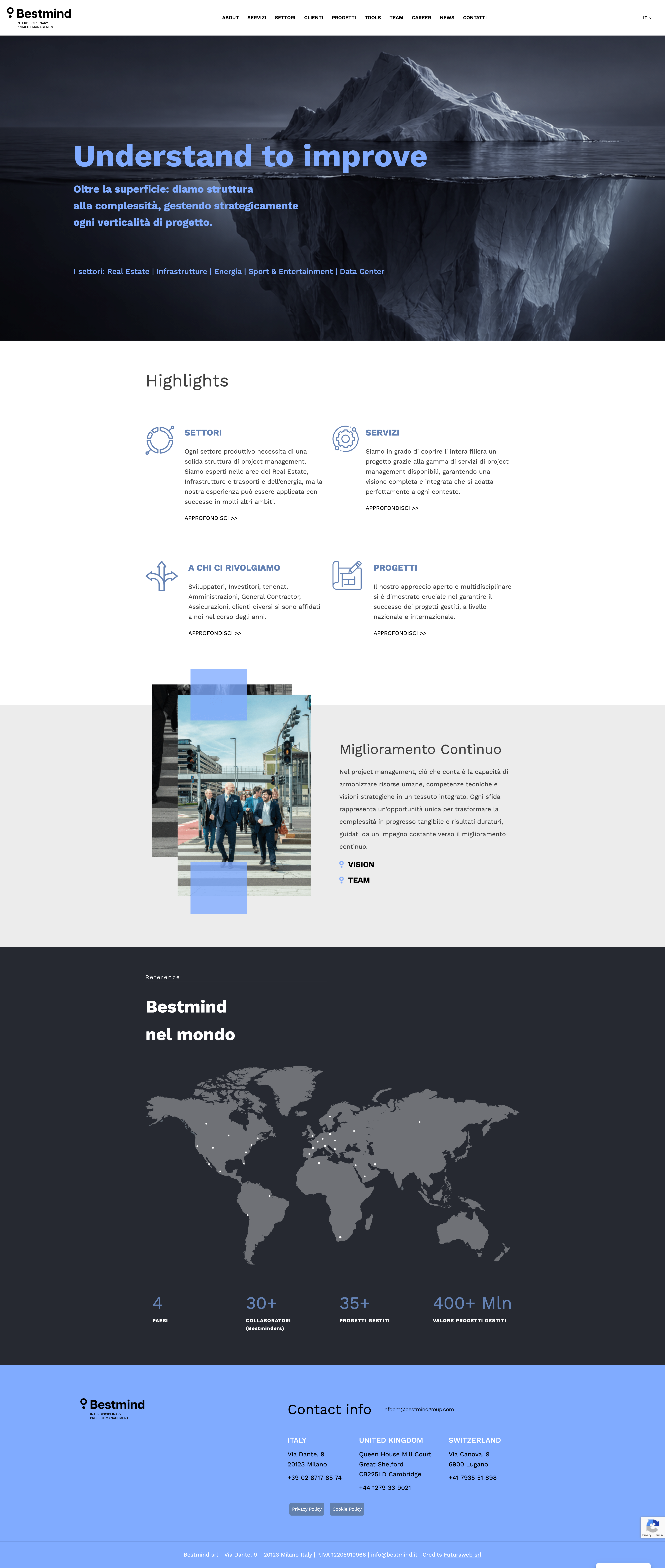 Bestmind opera nel coordinamento e nella gestione di progetti complessi lungo l’intero ciclo di vita, seguendo le attività dalla fase di fattibilità fino alla realizzazione e alla messa in esercizio. Offre servizi come due diligence, design management, cost control, procurement e risk management. Grazie al nuovo sito web, l’azienda può comunicare con maggiore chiarezza il proprio approccio multidisciplinare e rafforzare la propria presenza digitale, presentando in modo più efficace competenze, progetti e ambiti di intervento.